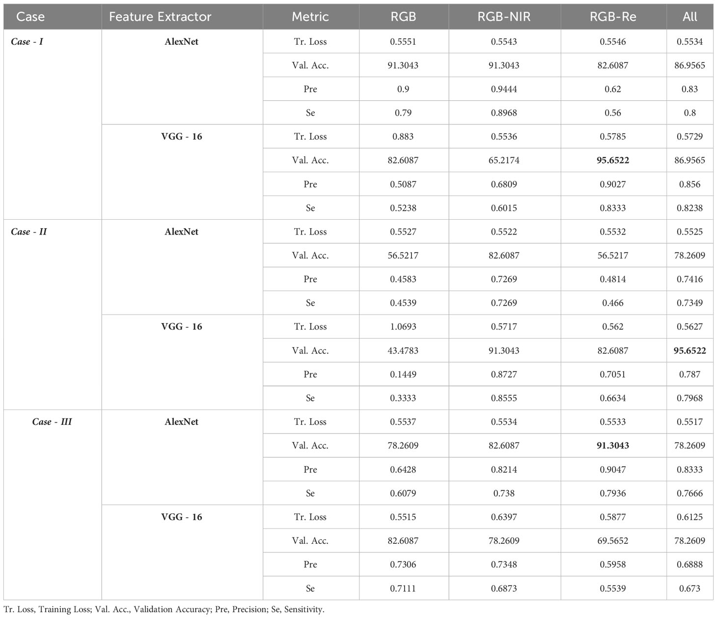 In the spectral analysis conducted as part of the ablation study, three experiments were considered: RGB, RGB+NIR, RGB+Re, and all bands (as shown in Table 9). In Case I, the VGG-16 model achieved the highest test accuracy of 95.65% using RGB and red-edge data, highlighting the significance of spectral information for model robustness. In Case II, the VGG-16 model achieved the highest test accuracy of 95.65% when using all spectral bands. In Case III, the AlexNet model achieved the highest accuracy of 91.30% with RGB and red-edge information. Notably, the model a precision of 0.9027 (as shown in Case I) with standard convolution using RGB and Re bands. In Case II, with standard convolution and the integration of the BiLSTM network and weighted attention, the VGG-16 backbone model achieved a precision of 0.8727. In Case III, when using deformable convolutional layer with BiLSTM and weighted attention, along with AlexNet as the backbone, the model achieved a precision of 0.9047 with RGB and red-edge information. However, in cases where VGG-16 served as the backbone, the NIR and Re bands introduced essential features, leading the deformable convolutional layer to capture redundant spatial feature vectors and ultimately resulting in a reduction in accuracy compared to RGB data.