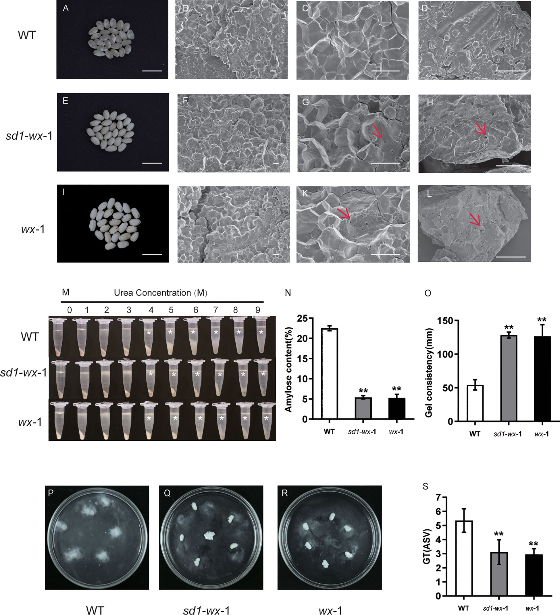 Figure 4 An analysis of starch phenotypic and physicochemical characteristics in WT and wx mutants. Comparative analysis of brown rice appearance between WT (A) and sd1-wx-1 (E) and wx-1 (I); Bar = 1 cm. Scanning electron microscopy images of cross sections of the WT (B, C) and sd1-wx-1 mutant (F, G) grains and wx-1 (J, K). Scale bars, 10 µm and magnifications of 1,000× in (B, F, J); 10 µm and magnifications of 3,000× in (C, G, K). Scanning electron microscope images of WT (D) and sd1-wx-1 mutant (H) and wx-1 (L) brown rice powders. Scale bars, 10 µm and magnifications of 3,000× in (D, H, L). Small cavities are marked by red arrows. (M) Gelatinization properties of starch in urea solutions. Starch powder of WT and sd1-wx-1 and wx-1 was mixed with different concentrations of urea solution. * indicate the starch from the endosperm of sd1-wx-1 and wx-1 were more difficult to gelatinize than that from the endosperm of WT in urea solutions of 4-9 M. (N) The amylose content in endosperm of WT and sd1-wx-1 and wx-1. (O) The gel consistency in endosperm of WT and sd1-wx-1 and wx-1. The seed alkali spreading score (ASS) during WT (P) and sd1-wx-1 (Q) and wx-1 (R). The GT (gelatinization temperature) values were estimated indirectly by the alkali spreading score (ASS) during WT and sd1-wx-1 and wx-1 (S). ** indicate statistical significance between WT and wx mutant lines at p< 0.01.