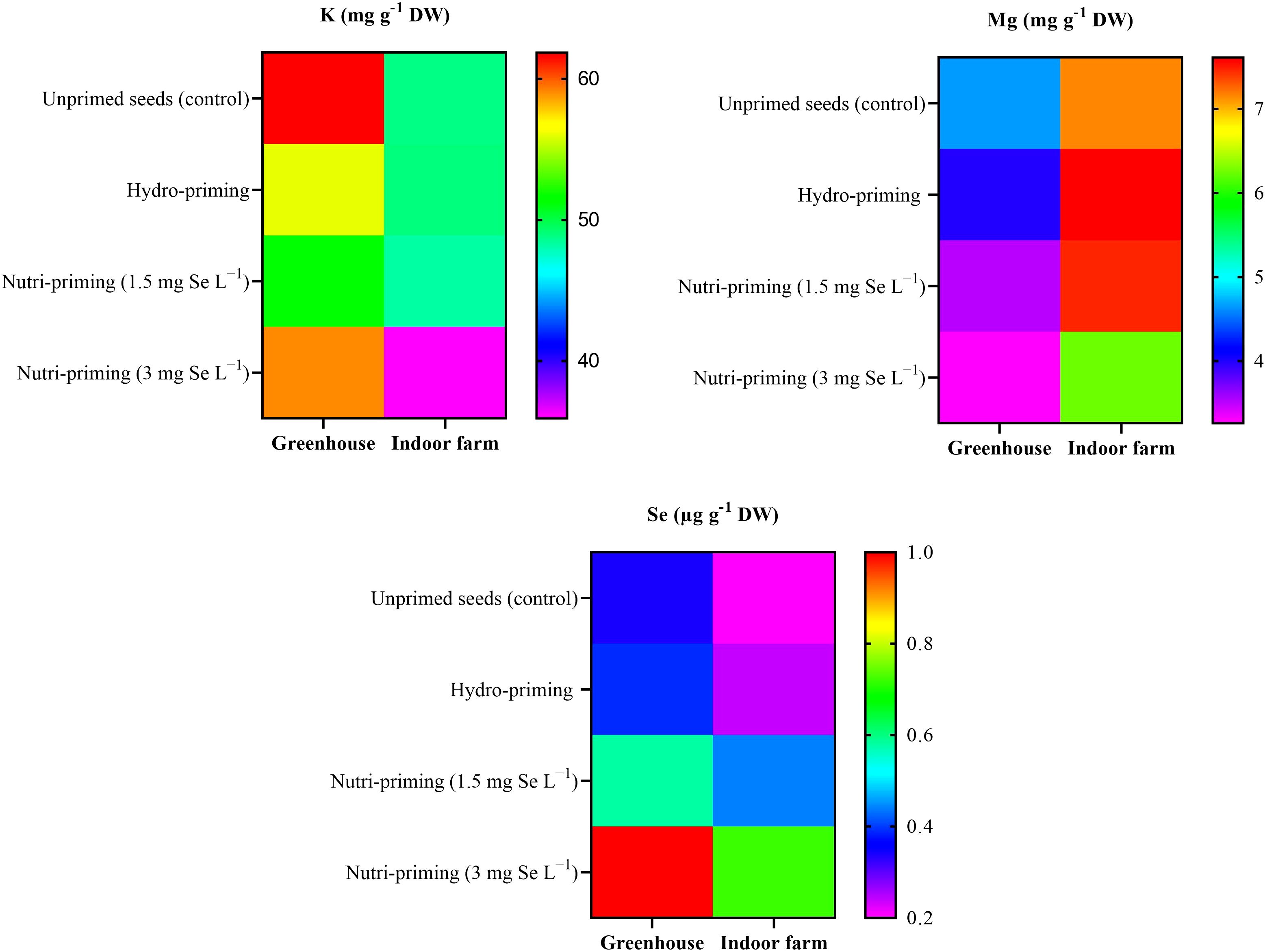 Figure 2. Visual representation of the trends of mineral elements (K, Mg, Se) among treatments as well as between greenhouse and indoor farm conditions.