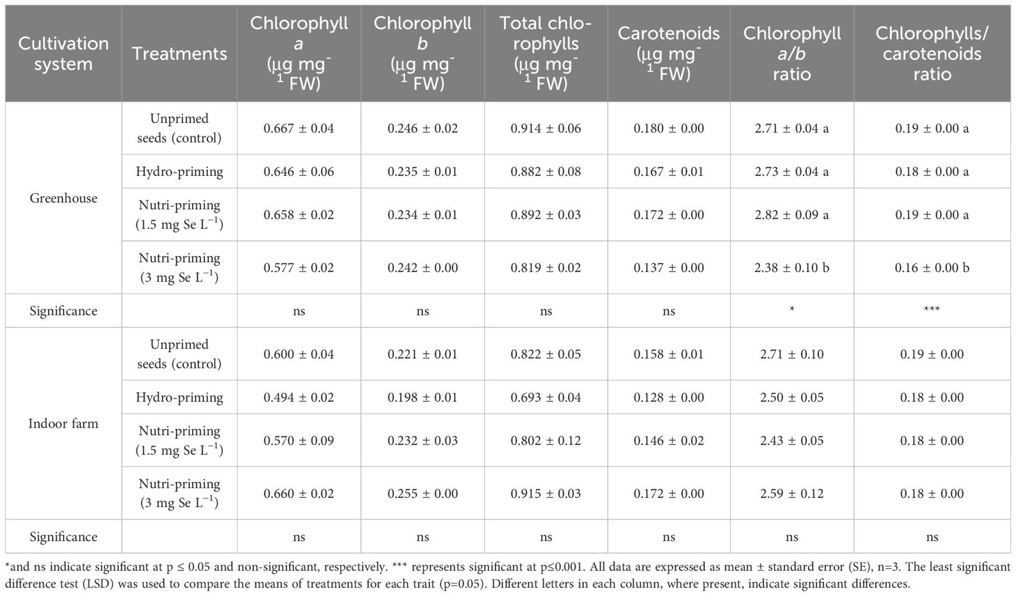 In both cultivation systems, the concentration of chlorophyll a, chlorophyll b, total chlorophylls, and carotenoids were not affected by the treatments. However, different Se-priming treatments significantly affected the chlorophyll a/b ratio and the chlorophylls/carotenoids ratio in greenhouse (Table 5). More precisely, in greenhouse, nutri-priming with 3 mg Se L−1 significantly reduced the chlorophyll a/b ratio and the chlorophylls/carotenoids ratio compared to unprimed seeds by 12.91% and 15.78%, respectively. According to the t-test results, there was no significant difference in the concentration of photosynthetic pigments of dill microgreens grown in either system, although the average chlorophyll a concentration of the microgreens grown indoor was 19.04% higher than those grown in greenhouse (Table 2).