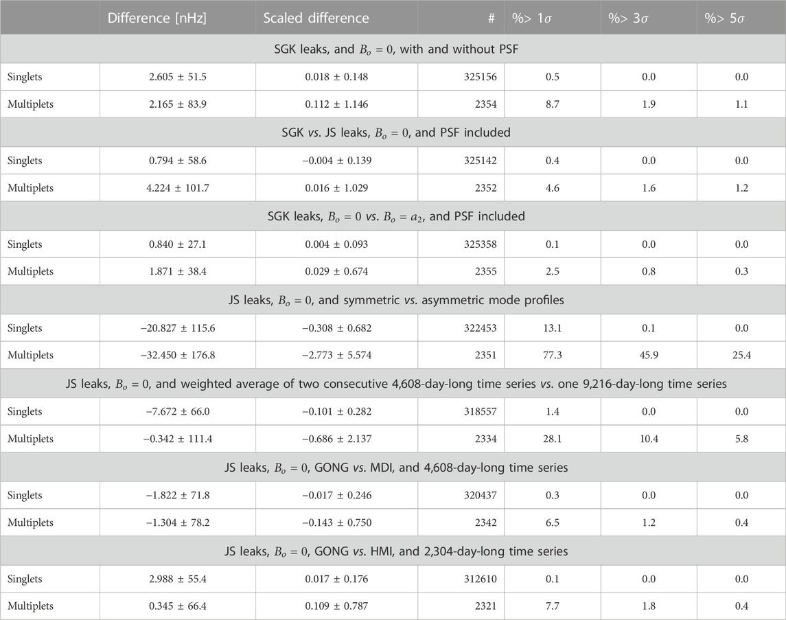 Figure 3 shows similar comparisons for the multiplet frequencies when using either 1) the leakage matrix computed by Schou (JS) or 2) the leakage matrix I computed for
