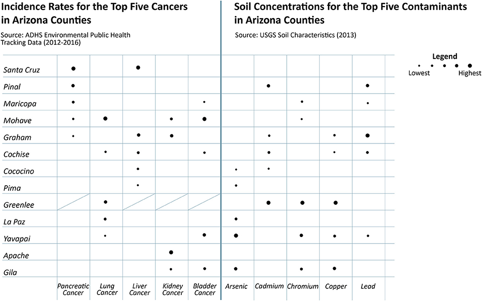 Though we have not yet used this methodology extensively, Figures 3–5 are example visualizations generated from the integration of selective datasets at the county level, demonstrating initial and further anticipated results. We recognize that causality cannot be inferred, but these examples show how the database can help inform hypothesis generation and identify counties that are suffering more from selected health outcomes and/or environmental quality challenges. These visualizations were created to align with the questions posed in Table 3 to illustrate the breadth of this methodology. For example, arsenic and chromium (inhalation route only) are recognized as human carcinogens by USEPA, while cadmium and lead are classified as probable carcinogens (e.g. USEPA Integrated Risk Information System, USEPA, 2021). Figure 3 supports hypothesis generation, specifically asking whether arsenic, cadmium, chromium, and/or lead soil concentrations occur in counties with high incidence rates of the most commonly observed cancer types, informing questions 3–4 in Table 3. We see that Mohave county experiences bladder, lung, kidney and pancreatic cancers, but is only impacted by chromium in soil, whereas Yavapai county is impacted by all metal(loid)s except cadmium and the bladder and lung cancer incidence rates are among the top five. Greenlee county has the highest concentrations of cadmium, chromium, and copper (currently not classified as a human carcinogen), however the Arizona Department of Health Services dataset is missing selected cancer incidence rates, which we will gather from another source listed in Table 1.