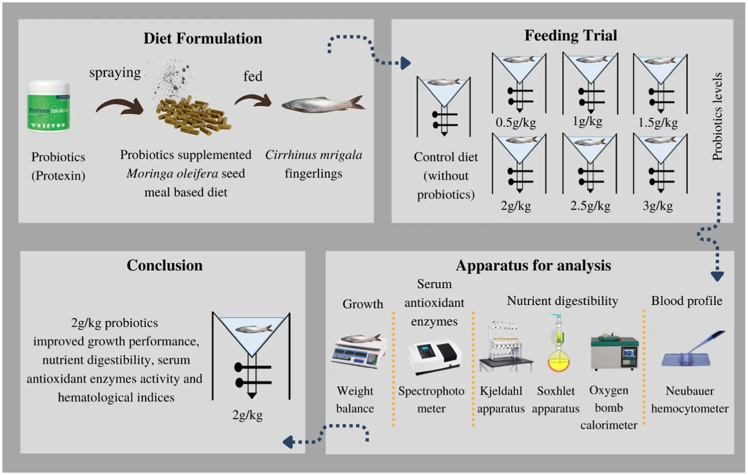 Probiotics, live and non-pathogenic microbes, are gaining significant recognition for their diverse health benefits in hosts, including improved gut health and a balanced gut microbiome (Hu et al., 2017). Multi-strain probiotics, like the commercially available protexin, offer advantages over single-strain options due to their combination of lactic acid bacteria, yeast, and fungi (Firouzbakhsh et al., 2011; Hossain et al., 2022). These microbes are essential for digestion, nutrient uptake, immunity, and disease resistance (Diwan et al., 2022). Probiotics enhance digestive enzyme efficacy, resulting in improved nutrient absorption and digestion in fish. They can also increase intestinal villi height, maximizing the surface area for nutrient uptake (Tong et al., 2023). Furthermore, probiotics upregulate antioxidant enzymes, strengthening the body’s defense system against stress (Gobi et al., 2018). Since Cirrhinus mrigala, an agastric fish, experiences extended food retention in its small intestine, probiotics can be particularly beneficial. By detoxifying harmful microbes and boosting digestive enzymes, probiotics can significantly improve nutrient absorption (Ntakirutimana et al., 2023). Therefore, this study aims to develop a new aquaculture feed formula containing varying levels of probiotics and assess its impact on growth, digestibility, antioxidant enzyme activity, and blood parameters in C. mrigala.