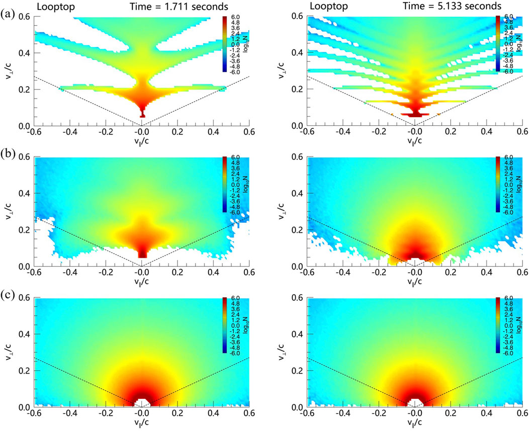 As shown in Figure 5, in the loopleg region, the velocity space distributions look different from that in the looptop. In panels (a) and (b), at the early time, the first stripe (close to the origin of the coordinate system) is circular-shaped and represents the contribution from the beam-like electrons before getting reflected. The distribution resembles the so-called horseshoe distribution as observed in the source of auroral kilometric radiation (AKR, see, e.g., Ergun et al., 2000; Treumann, 2006). It contains positive gradients in both parallel and perpendicular directions, i.e.,