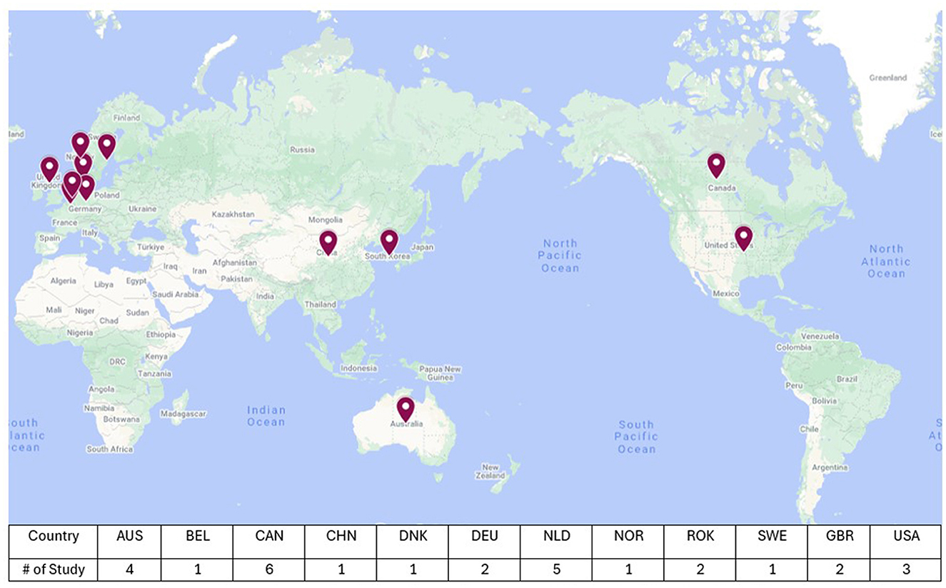Figure 3. Country and number of publications from empirical studies (n = 27, Google My Map, 2024). Please note that some studies comprised more than one country (Lee et al., 2021; Roberts, 2023).