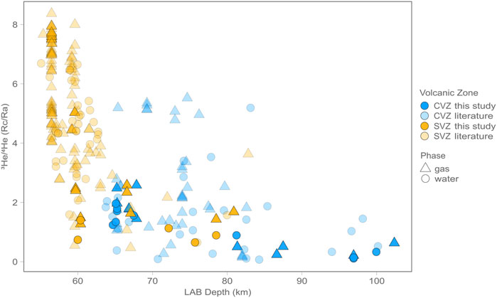 FIGURE 5. Helium isotopes vs. Lithosphere Asthenosphere Boundary (LAB) depths according to the model of Tassara and Echaurren (2012) for gas (triangles) and water (circles) phase samples. Notably there is a negative correlation between He isotopes (RC/RA)and LAB depth.