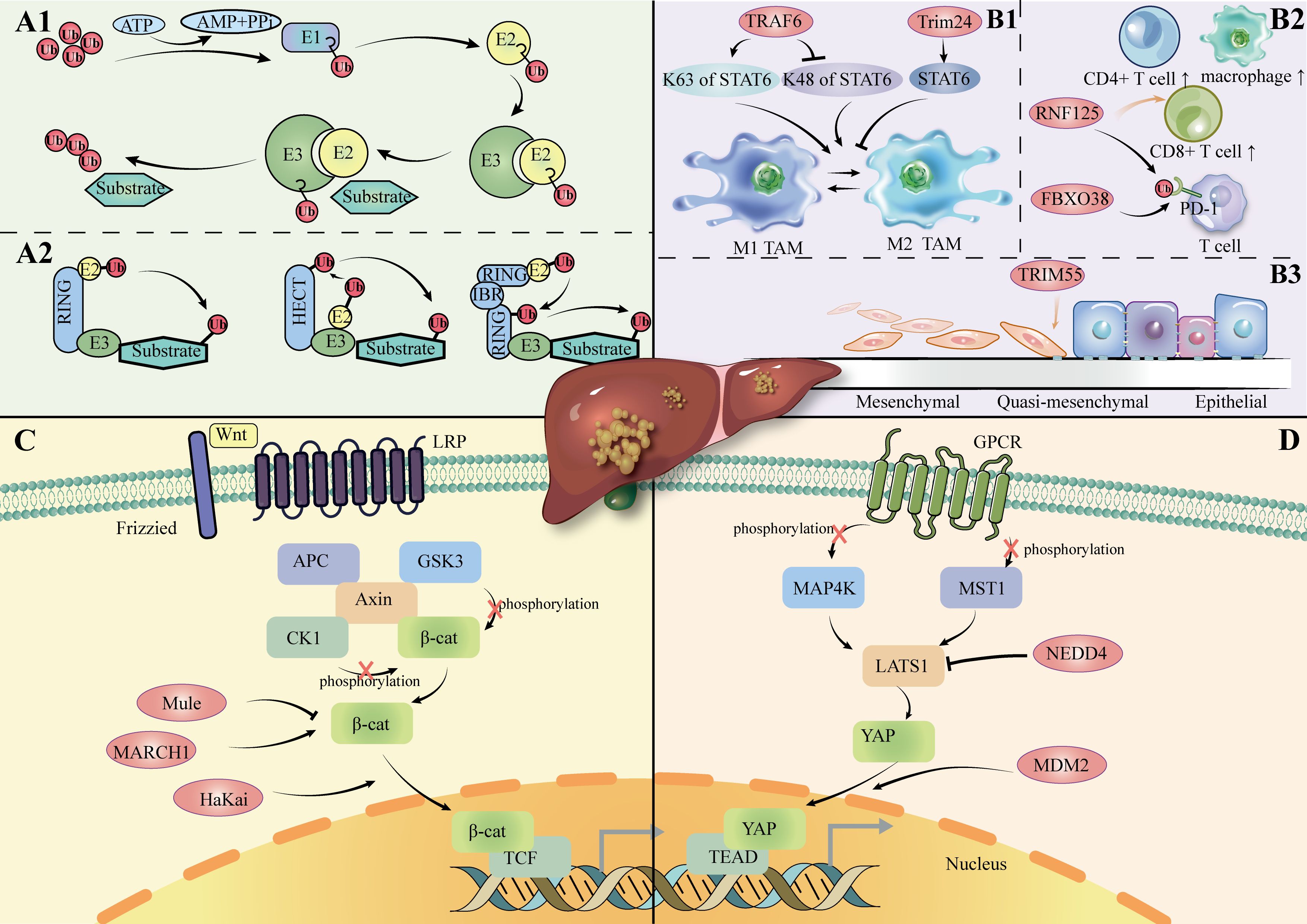 Figure 1. (A1): Ubiquitination process. (A2): Overview of the E3 ligase family. (B1): E3 ligase regulates the polarization of TAM in HCC. (B2): E3 ligase regulates immune cells in HCC. (B3): E3 ligase regulates the EMT process in HCC. (C): Role of E3 ligase in the Wnt/β-catenin channel in HCC. LRP: Low-Density Lipoprotein Receptor-Related; APC: Adenomatous Polyposis Coli; CK1: Casein Kinase 1; GSK3: Glycogen Synthase Kinase 3; TCF: T-cell Factor. (D): Role of E3 ligase in Hippo channels in HCC. MAP4K: Mitogen-Activated Protein Kinase Kinase Kinase Kinase; MST1: Mammalian Sterile 20-like kinase 1; TEAD: TEA Domain Family Member; GPCR: G-Protein-Coupled Receptor; Protein.
