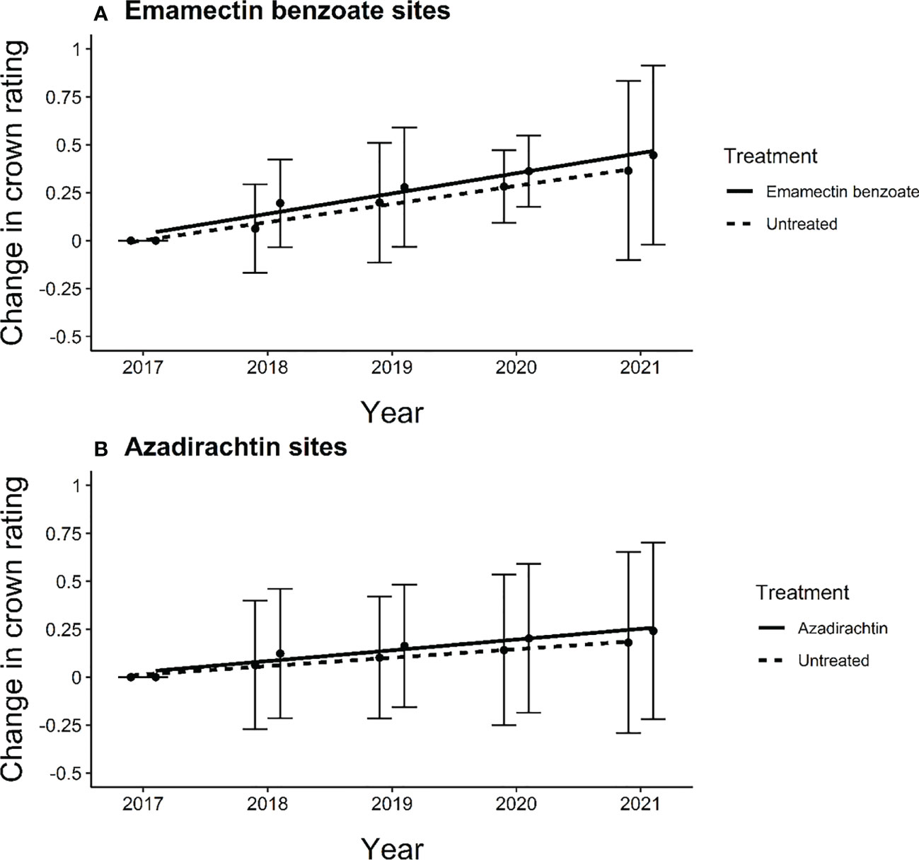 The crowns of the trees in our study sites proper did not decline over time. In fact, the average change in crown rating increased slightly from 2017 to 2021 for both treated and untreated trees at both emamectin benzoate and azadirachtin sites (Figure 3). In both types of sites, we noted gains between one quarter and one-half points, on average, across the five years of the study. The changes in mean crown rating over the five years of the study were similar between treated and untreated trees at both emamectin benzoate sites (F1,8 = 0.54, P=0.48) and azadirachtin sites (F1,8 = 0.87, P=0.38).