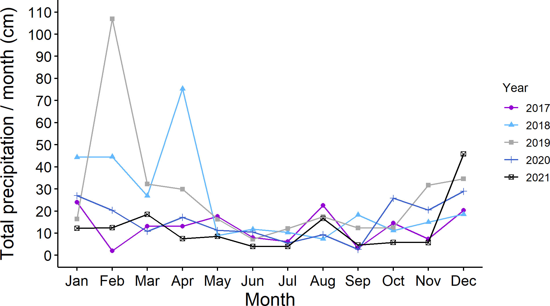 Figure 4 Total monthly precipitation (cm of precipitation/per month) in Saint Paul, Minnesota USA during five years of study (2017 to 2021).