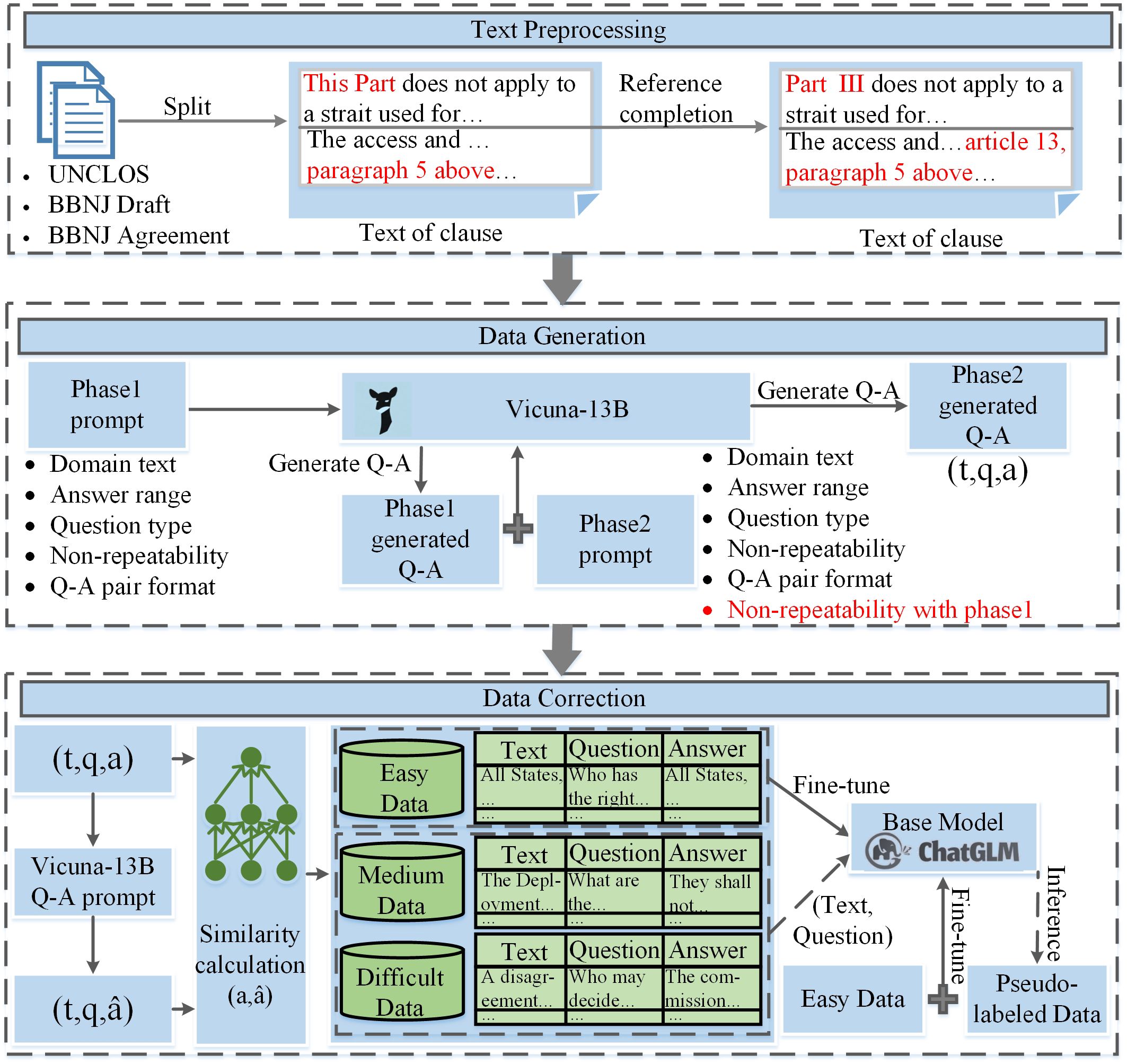 (1) We proposed a data engineering method, called PDGC, to generate a higher-quality Q-A dataset for the BBNJ domain. PDGC contains two-stage data-generation and iterative correction. The two-stage data-generation method enables the model to generate higher-quality data based on BBNJ Q-A examples. Moreover, our iterative correction improves correction quality by following the human learning pattern based on easy-to-difficult.