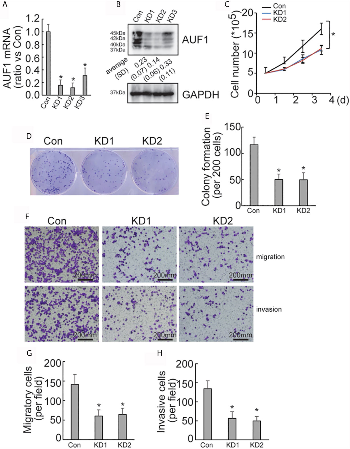 Figure 2 Proliferation, migration, and invasion ability of Con and AUF1-knockdown TPC1 cells. (A) The CRISPR/Cas9 system was applied to knock down AUF1 in TPC1 cells, and Real time PCR was performed to clarify knockdown of AUF1 in thyroid cancer cells; (B) western blot was performed to verify the knockdown efficiency; (C) to evaluate the proliferation ability of TPC1 cells, 1 × 105 cells were seeded and counted on day 1–4 in both the control group (Con) and AUF1-knockdown groups (KD1 and KD2), n = 3, *P < 0.05; (D) TPC1 cells in Con, KD1, and KD2 groups were seeded separately as single cells with 200 numbers per well in a six-well plate, and a representative photograph of colony formation was presented; (E) the TPC1 colonies were quantitively analyzed by using ImageJ software, n = 3, *P < 0.05; (F) Transwell assay containing Matrigel were applied to observe the migration and invasion ability of TPC1 cells in Con, KD1, and KD2 groups, respectively. The representative photographs under microscope (200 μm) were shown; (G) the numbers of migrated cells in Transwell assay were counted, n = 3, *P < 0.05; (H) the numbers of invading cells in Matrigel containing Transwell assay were counted, n = 3, *P < 0.05.