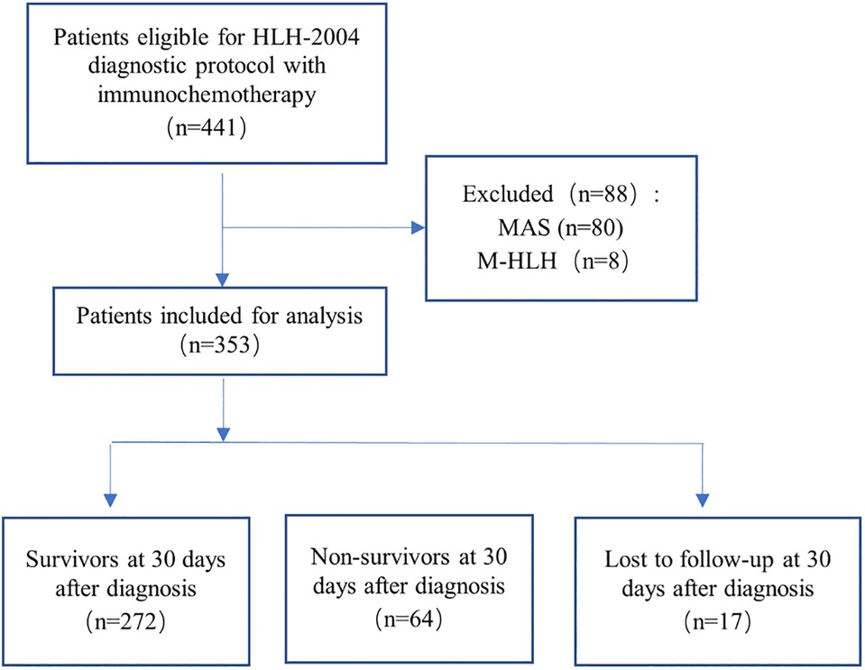 Figure 1. Flowchart of inclusion and exclusion. Abbreviations: MAS, macrophage activation syndrome; M-HLH, malignancy-associated HLH.