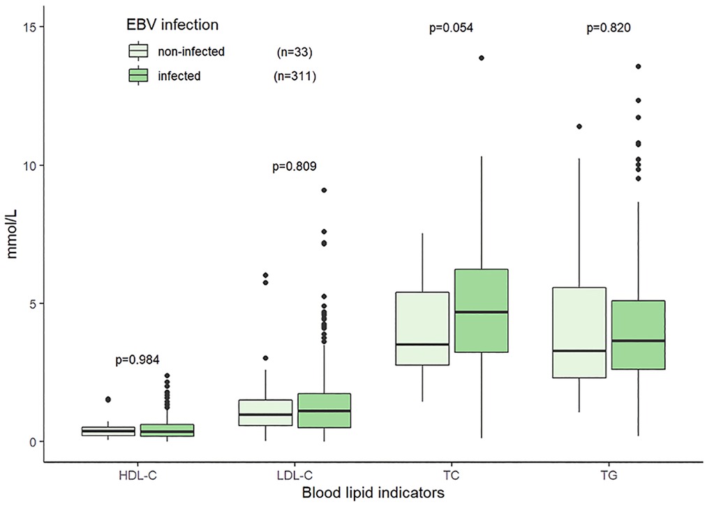 Figure 3. Distributions of blood lipid indicators in the patients with EBV infection and without EBV infection. Note: 344 patients tested for both EBV and lipid indicators.