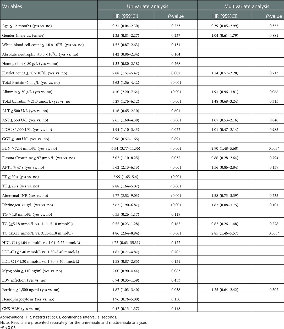 Table 3 shows the results of univariable and multivariable Cox regression analyses of early mortality in children with HLH. The multivariable analysis showed that BUN ≥7.14 mmol/L [HR = 2.90, 95% CI: (1.48–5.68), p = 0.003] and TC ≤ 3.11 mmol/L [HR = 2.85, 95% CI: (1.46–5.57), p = 0.003] were significantly associated with the survival within 30 days after diagnosis. To validate the robustness of results, a multivariable logistic regression was also performed and identified the same risk factors (Table 4). In addition, similar results were obtained from the Cox and logistic regression models using only complete cases (Figures 7, 8).