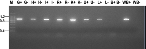 Figure 2. Tissue distribution of AQP1a transcript in seawater acclimated silver sea bream. Abbreviations: M, molecular marker (sizes indicated kb); G, gill; H, heart; I, intestine; R, rectum; K, kidney; U, urinary bladder; L, liver; B, brain; and WB, whole blood. A (+) or (−) after an abbreviation indicates reverse transcriptase reactions that were performed with or without MMLV respectively.