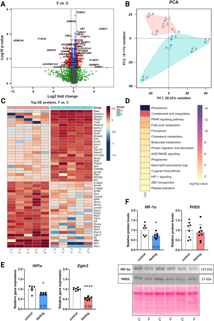Figure 1. The effect of 3-day fasting on the proteome and HIF-1α and PHD3 (Egln3) levels. (A) Volcano plot of all 4,652 proteins detected by the proteomic analysis. (B) PCA (principal component analysis). (C) Heat map of the 50 top significantly changed proteins. (D) KEGG Annotation heat map of the main pathways affected by fasting (E) Gene expression levels of Hif1a and Egln3 assessed by RT-qPCR. (F) Protein levels of HIF-1α and PHD3 assessed by Western blot and representative Western blot membranes. The average of the control values is set to 1. Values are means ± SD; n = 5–8; *p < 0.05, ****p < 0.0001 (t-test). C – control; F – fasting; Egln3/PHD3 – prolyl hydroxylase 3; HIF-1α – hypoxia-inducible factor 1α.