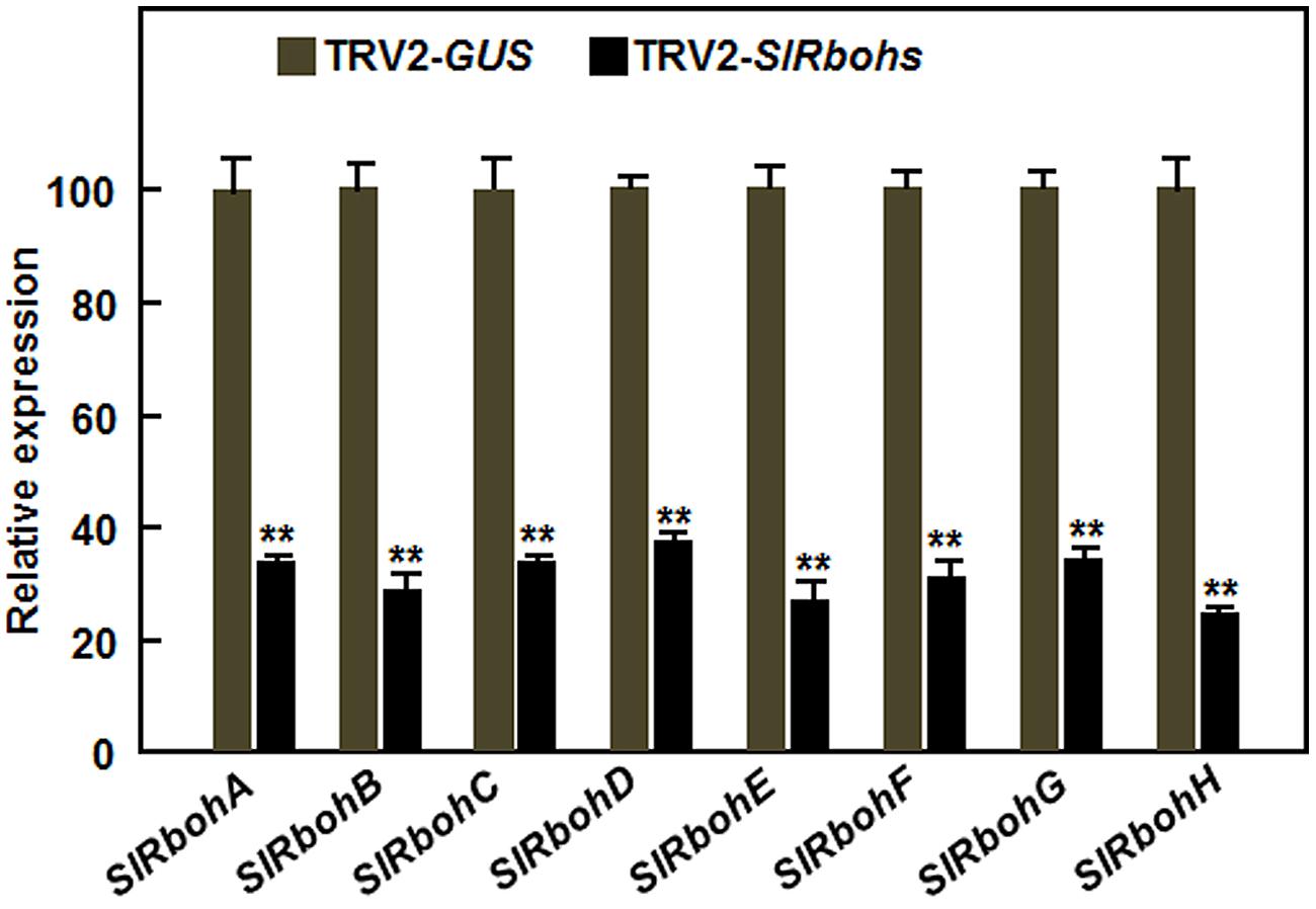 FIGURE 3. Silencing efficiency of the SlRboh genes in silenced plants. Two-week-old plants were infiltrated with agrobacteria harboring TRV2-SlRbohA-H or TRV2-GUS and leaf samples were collected at 3 weeks after VIGS infiltration. The silencing efficiency was calculated by comparing the transcript levels of the SlRboh genes in TRV2-SlRbohs-infiltrated plants with those in TRV2-GUS-infiltrated plants, which were set as 1. Data presented are the means ± SD from three independent experiments and ** above the columns indicate significant differences at p < 0.05 level.
