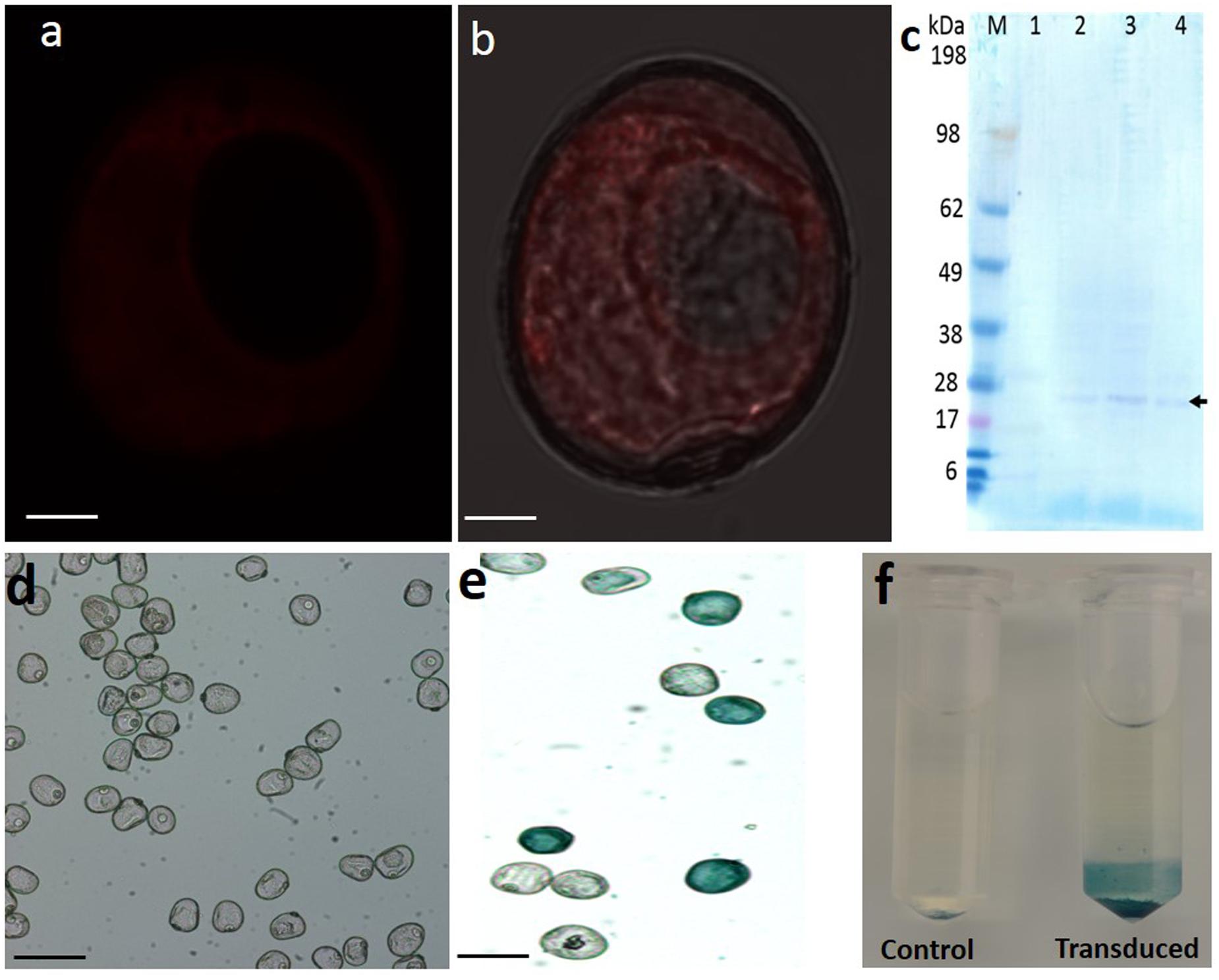 FIGURE 2. Western blot analysis and GUS assay. Total microspore protein were analyzed using western blotting with specific Anti-His HRP-conjugated antibodies (1:1000). (a,b) Confocal microscopy imaging of trypsin-EDTA (0.25%) washed microspores, red fluorescence denotes Bcl-2△21 labeled Alexa Fluor® 647 inside the microspore but absent in exine. Bars: 20 μM. (c) Western blotting with specific Anti-His HRP-conjugated antibodies (1:1000). M, prestained benchmark protein marker (ThermoFisher Scientific). 1, total protein extracted from untreated microspores. 2–4, total protein extracted from Bcl-2△21 treated microspores. The arrow denotes the presence of specific Bcl-2△21 bands. GUS histochemical staining using 5-bromo-4-chloro-3-indolyl glucuronide (X-Gluc) as the substrate in microspores after transduction. (d) GUS protein without R10HL; (e) GUS protein conjugated with R10HL; (f) GUS assay without R10HL (control), GUS protein conjugated with R10HL (transduced). All other conditions were as mentioned in Figure 1.