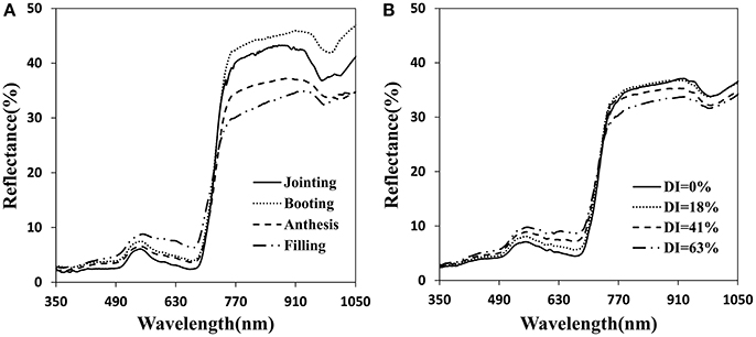 Figure 3. Canopy reflectance spectra for the different infected developmental stages (A) and for different disease index of powdery mildew at anthesis (B).
