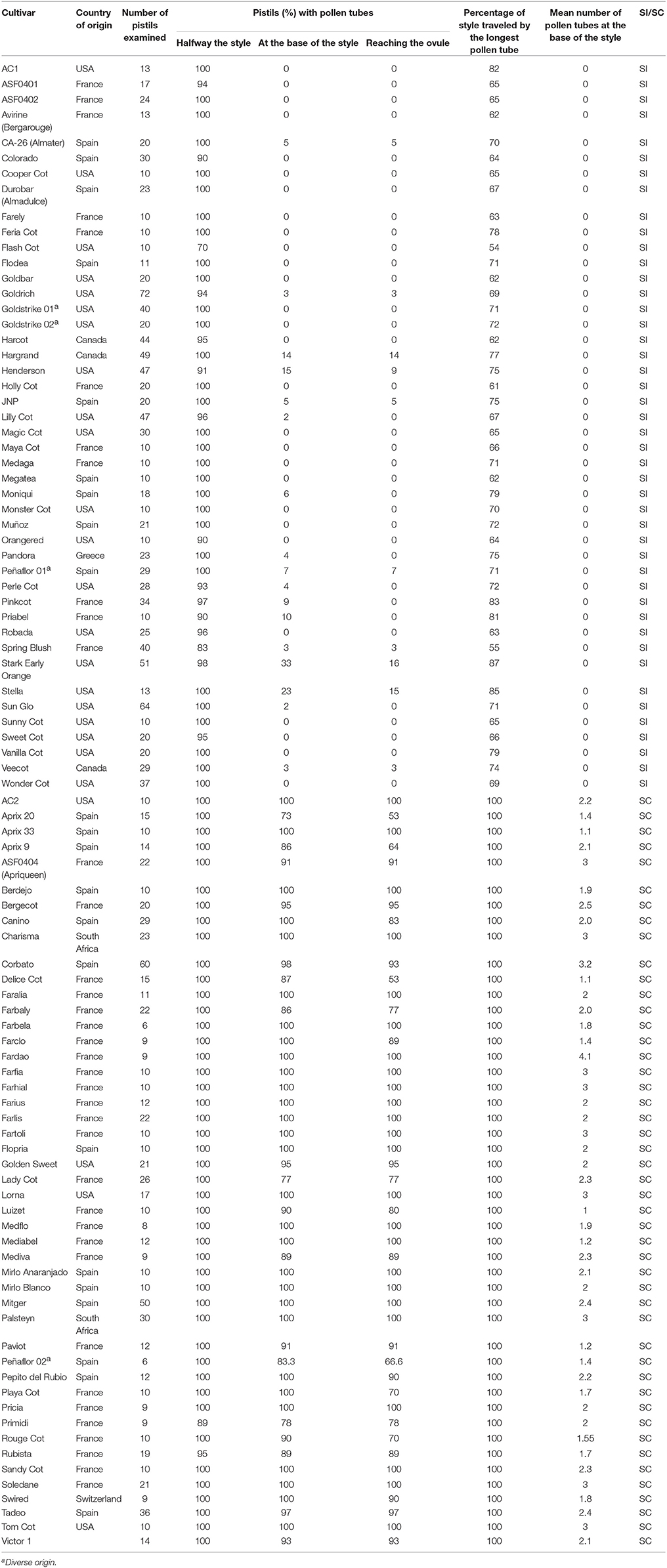 Table 1. Country of origin, number of pistils examined, percentage of pistils with pollen tubes halfway the style, at the base of the style, and reaching the ovule, percentage of style traveled by the longest pollen tube, mean number of pollen tubes at the base of the style, and self-incompatibility (SI) or self-compatibility (SC) of 92 apricot cultivars analyzed in this work.