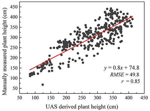 Compared to other percentile values, a stronger linear correlation was obtained (r = 0.85) between the 90th percentile of estimated plant height from the RGB orthomosaic and the manually sampled plant height in 363 plots in September 2017 (Figure 4). The RMSE was 49.8 cm and the r was 0.85 between UAS derived plant height and manually measured plant height. The coefficient of variation (CV) for aerial data estimated plant height was 32.11% and for manually measured plant height was 27.92%.