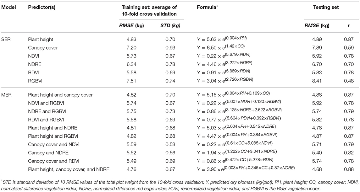 Table 5. Dry biomass estimation results in 10-fold cross validation as well as in the testing set, based on simple exponential regression (SER) and multiple exponential regression (MER) model.