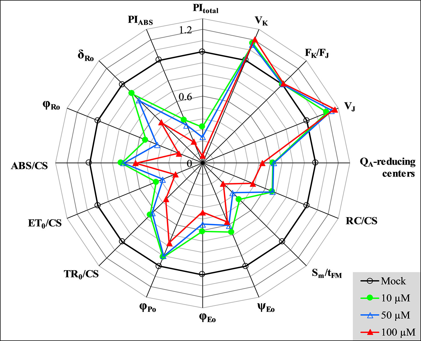 Figure 5 Spider plot presentation of selected parameters derived from JIP-test quantifying PSII behavior of C. reinhardtii cells treated with various concentrations of GT. Each parameter is expressed as fraction relatively to the values of the control (mock, back regular circle with value 100% = 1).