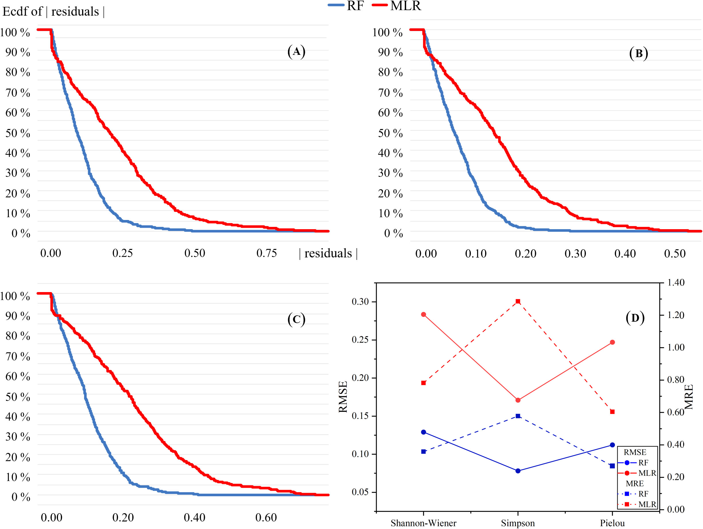 Figure 5 Reverse cumulative distribution of residuals of MLR and RF models. (A–C) represent Shannon–Wiener, Simpson and Pielou diversity indices, respectively. (D) is the results of RMSE and MRE of the two prediction models.