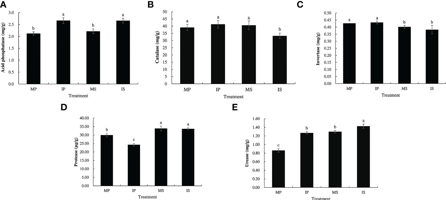 Figure 2 Five enzyme activity of rhizosphere soil in different planting patterns. MP, MS, IP and IS represent monoculture peanut, monoculture sugarcane, intercropping peanut and intercropping sugarcane, respectively. (A) Acid phosphatase; (B) catalase; (C) invertase; (D) protease; (E) urease. Six biological replicates were used in this experiment, and same letters represents not significantly different (S-N-K’s test, α = 0.05).