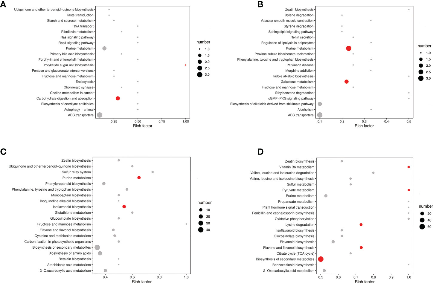 Figure 5 The top 20 pathways of significant of the upregulated and down-regulated differential metabolites on KEGG. (A) MP-S vs. IP-S comparison; (B) MS-S vs. IS-S comparison; (C) MP-R vs. IP-R comparison; (D) MS-R vs. IS-R comparison. Red indicated that the pathway was significantly enriched (P < 0.05), and gray indicated that the pathway was not significantly enriched. Panel A and B are plotted based on the mean of six replicates, and panel (C, D) were plotted based on the mean of three replicates.