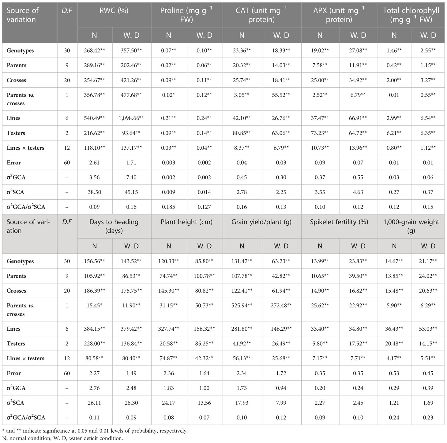 Table 2 Mean square estimates of ordinary, line × tester, and combining ability analyses for physiological, biochemical, and yield-related (and its components) traits under normal watering and water deficit conditions.