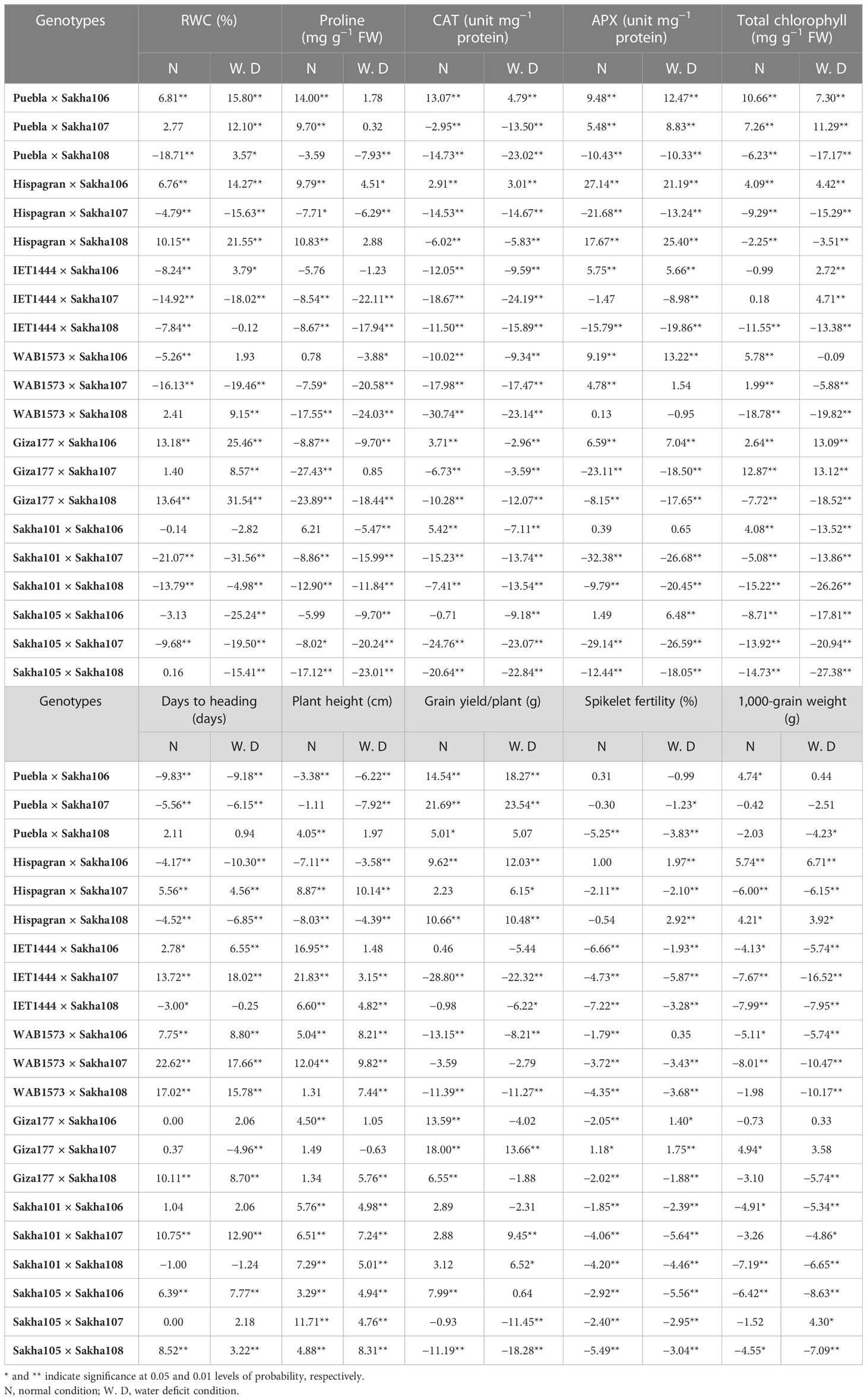 Table 6 Estimates of heterosis as a deviation from a better parent (heterobeltiosis) of the F1 hybrids for physiological, biochemical, and yield-related (and its components) traits under normal watering and water deficit conditions.