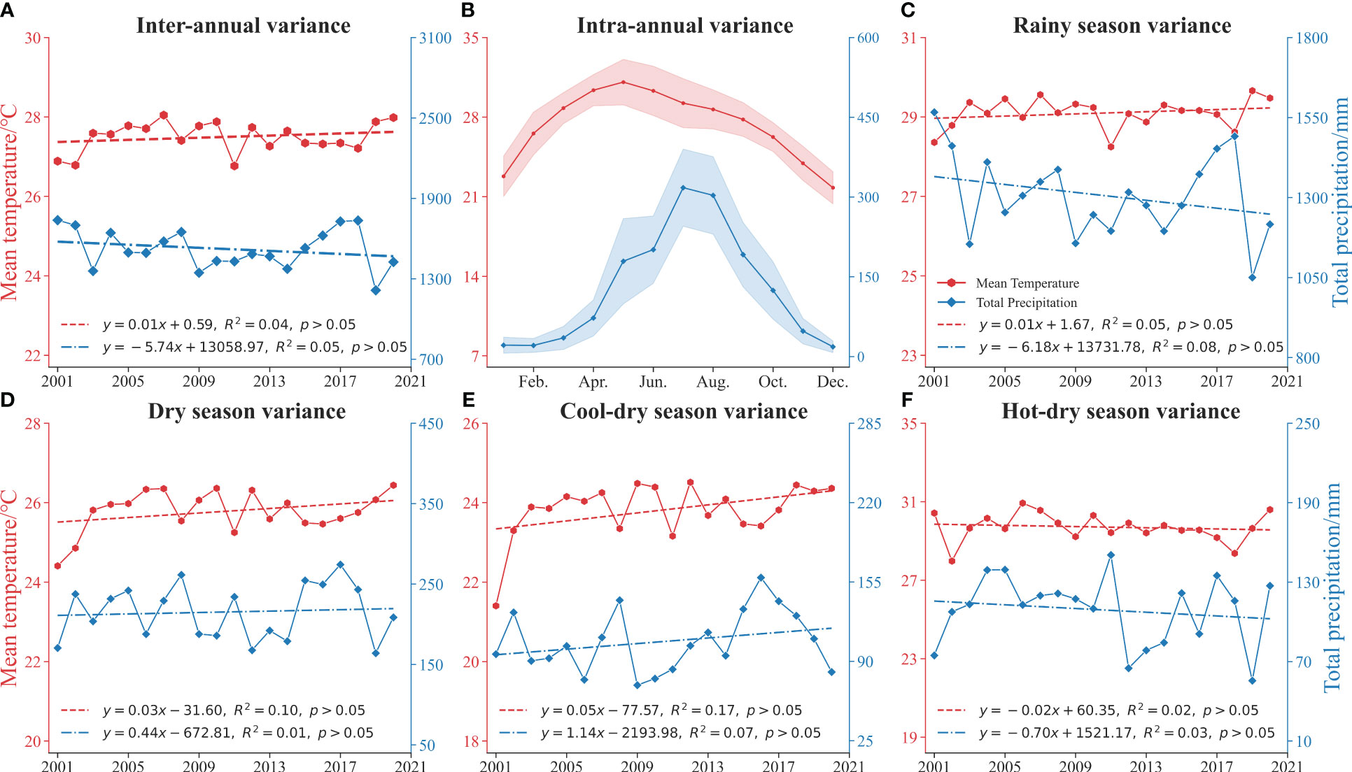 Figure 7 Annual and season variation of mean temperature and total precipitation: (A) Inter-annual variance, (B) Intra-annual variance, (C) Rainy season variance, (D) Dry season variance, (E) Cool-dry season variance, (F) Hot-dry season variance.