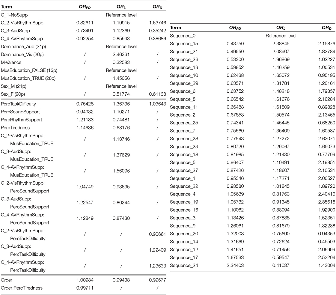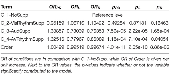 Statistical analysis of the distribution of the three performance scores revealed that auditory support of the visual target stimuli significantly increases the task performance (i.e., having a more correct sequence recall). On the other hand, rhythmic audio support is not different from non-rhythmic audio support. The models that best represent these distributions are those that do not take into account personal characteristics. Therefore, odds ratios and significance values for models PD1, L1 and D1 are presented in Table 4. These models show a significant positive influence for conditions with auditory support and thus agree with the measured data. Likewise the absence of a rhythmic support effect can be confirmed.