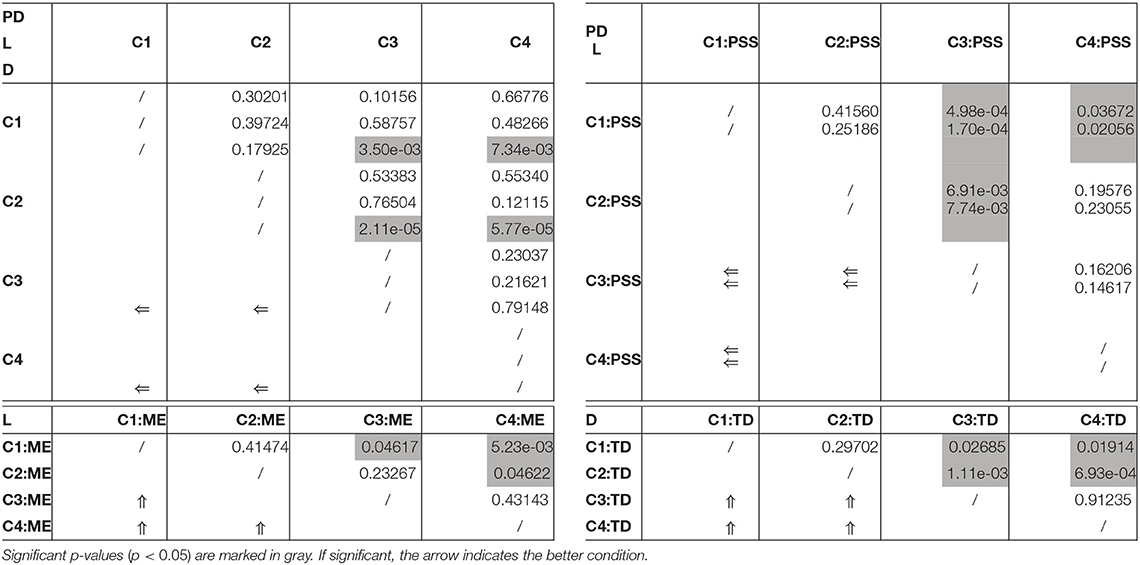 Finally, across all conditions scores were significantly worse for those that rated the task as rather difficult (Wilcoxon; C_1-NoSupp, PD: p = 1.9e-08, L: p = 6.3e-08, D: p = 4.8e-04; C_2-VisRhythmSupp, PD: p = 1.2e-06, L: p = 4.7e-06, D: p = 4.3e-03; C_3-AudSupp, PD: p = 1.2e-05, L: p = 1.2e-04, D: p = 1.9e-03; C_4-AVRhythmSupp, PD: p = 1.7e-04, L: p = 5.6e-04, D: p = 2.3e-05). An example of this behavior in case of the Distraction score is displayed in Figure 3G.