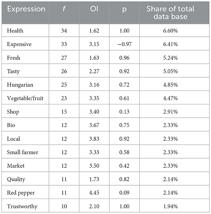 Looking at the result, there is an unexpected association with the second highest frequency; “expensive” (f = 33) and almost every time it was judged as a negative term, with an average polarity of −0.970. It can be concluded that one of the main weaknesses of local food may be that young consumers find it too expensive. The perception of local food as expensive presents a challenge that producers must tackle. Exploring innovative pricing strategies or emphasizing the added value of local products, such as superior freshness and reduced environmental impact, may increase consumers' willingness to pay; however, further research is needed to address this issue effectively.