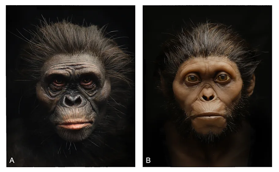 Pigmented silicone casts of facial reconstructions of Lucy (A) and the Taung child (B) showing different skin tones. Lucy’s tone has been reconstructed to appear more similar to that of bonobos, whereas the Taung child’s tone is more similar to that of anatomically modern humans native to South Africa. Image credit: R. Campbell, G. Vinas, M. Henneberg, R. Diogo