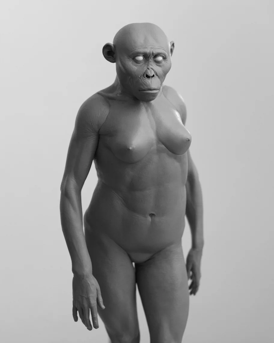 An intuitive reconstruction of Lucy’s soft tissues (without hair and pigment) produced in 2018 and reconstructed over the digitally reconstructed A.L. 288-1 skeleton published in Brassey et al. (2018). Image credit: R. Campbell, G. Vinas, M. Henneberg, R. Diogo