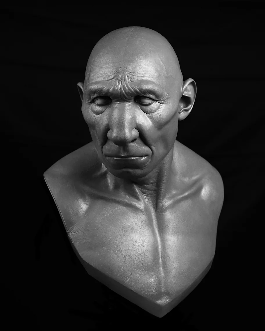 Facial reconstruction of Amud 1 (without hair and pigment) produced in 2019 that employed facial soft tissue regression models developed in Simpson and Henneberg (2002) from modern human material. Image credit: R. Campbell, G. Vinas, M. Henneberg, R. Diogo