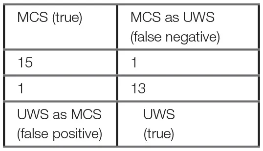 Conclusion: CI of MCS compared to UWS patients has high discriminative power and low false negative rate at one third of the estimated human assessors' misdiagnosis, providing an easy, inexpensive and non-invasive diagnostic tool. CI reflects functional connectivity changes in the CAN, suggesting that CI can provide an indirect way to screen and monitor connectivity changes in this neural system. Future studies should assess the extent of CI's predictive power in a larger cohort of patients and prognostic power in acute patients.