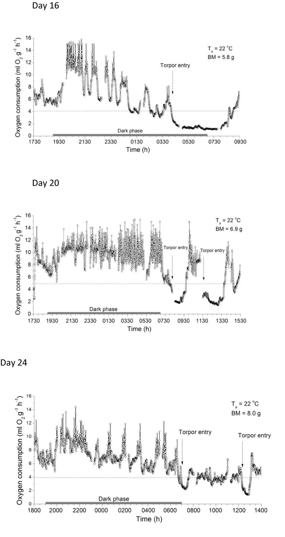 Figure 4. Metabolic rates (MR) of desert hamsters measured as oxygen consumption overnight. Note the high values during activity at night and the rapid fall of MR during torpor entry late at night or early in the morning. Torpor duration and depth decreased with age and increasing size. Gaps in the data points show baseline readings of the respirometry system every 3 h. Horizontal dotted lines show 75% of the resting metabolic rate measured at Ta 22°C.