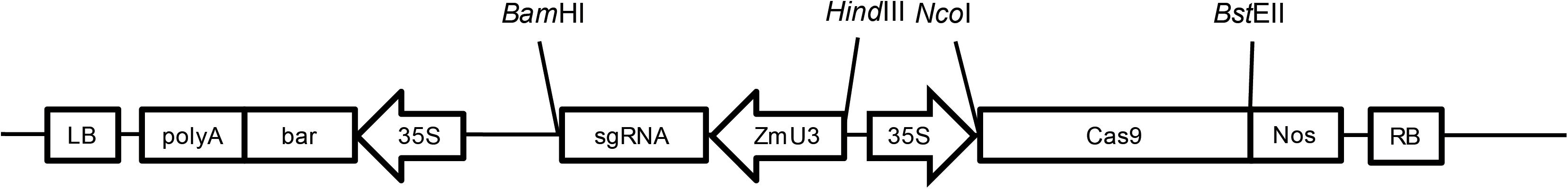 FIGURE 1. The T-DNA region of the pCAMBIA3301-Cas9-MS8ex2 plasmid. The codon-optimized Streptococcus pyogenes Cas9 (SpCas9) gene was inserted into the pCAMBIA3301 plasmid at NcoI and BstEII sites after the 35S promoter. The ZmU3::sgRNA was inserted into the BamHI and HindIII sites. LB, T-DNA left border; polyA, 35S polyA terminator; bar, bar gene; 35S, CaMV 35S promoter; sgRNA, single guide RNA; ZmU3, Zea mays U3 promoter; Cas9, Streptococcus pyogenes Cas9 gene; Nos, Nos terminator; RB, T-DNA right border; BamHI, HindIII, NcoI, BstEII are restriction enzyme sites.
