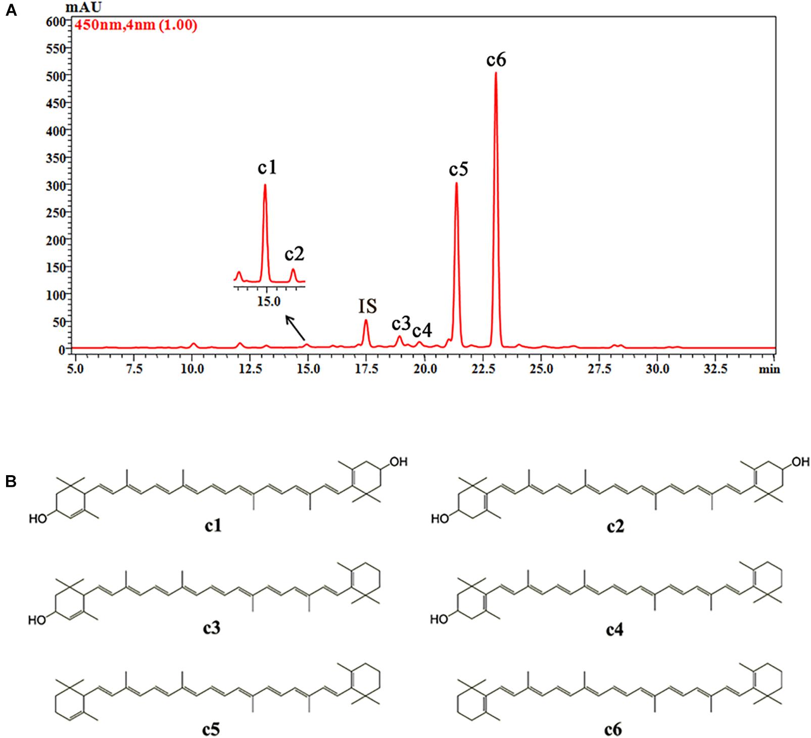 FIGURE 5. The HPLC chromatogram of carotenoids from petals of O. fragrans obtained at 450 nm (A) and their chemical structures (B). IS, internal standard.