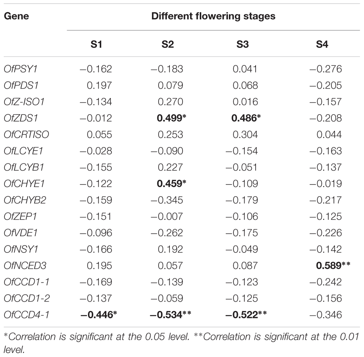 TABLE 4. The Pearson correlation between relative gene expression and total carotenoids content at different flowering stages.