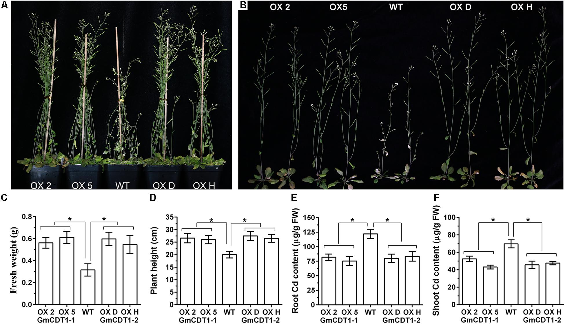 Figure 7. The overexpression Arabidopsis thaliana lines of GmCDT1-1 or GmCDT1-2 showed tolerance to Cd stress. (A,B) Phenotypes of A. thaliana transgenic lines and wild type (WT) after Cd treatment. (C–F) Fresh weight (C), plant height (D), root (E), and shoot (F) Cd content of the WT and transgenic lines. The experiment was performed with at least three independent biological replicates. Significant differences according to the one-way analysis of variance are denoted as follows: *p < 0.01.