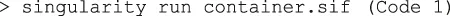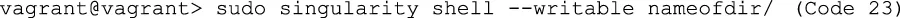 | Code 22 | vagrant@vagrant> sudo singularity exec --writable nameofdir/ /bin/bash |