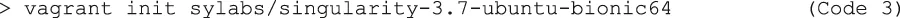 | Code 3 | > vagrant init sylabs/singularity-3.7-ubuntu-bionic64 |