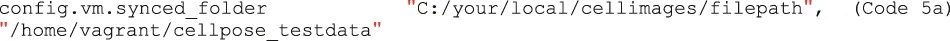 | Code 5a | config.vm.synced_folder "C:/your/local/cellimages/filepath", "/home/vagrant/cellpose_testdata" |