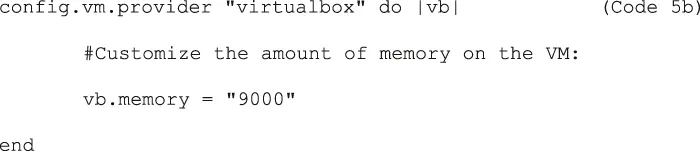 | Code 5b | config.vm.provider "virtualbox" do |vb| #Customize the amount of memory on the VM: vb.memory = "9000" end |