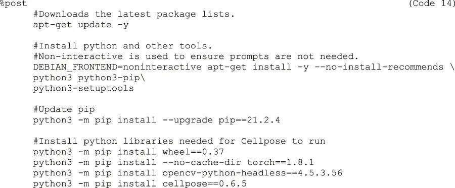 9d)Next, write the %post section (Code 14). This section is executed once while the container is built and run from inside the container. This means that all required software to run the imaging pipeline has be installed here. As Cellpose is a Python library, provide the commands to install Python, all required Python dependencies of Cellpose, and Cellpose itself here. It is good practice to provide version numbers, e.g., cellpose==0.6.5, for later reproducibility.